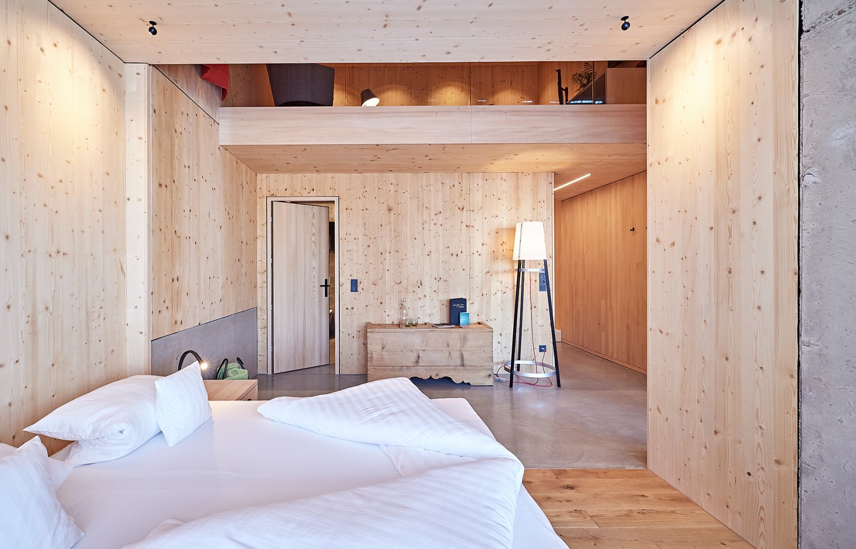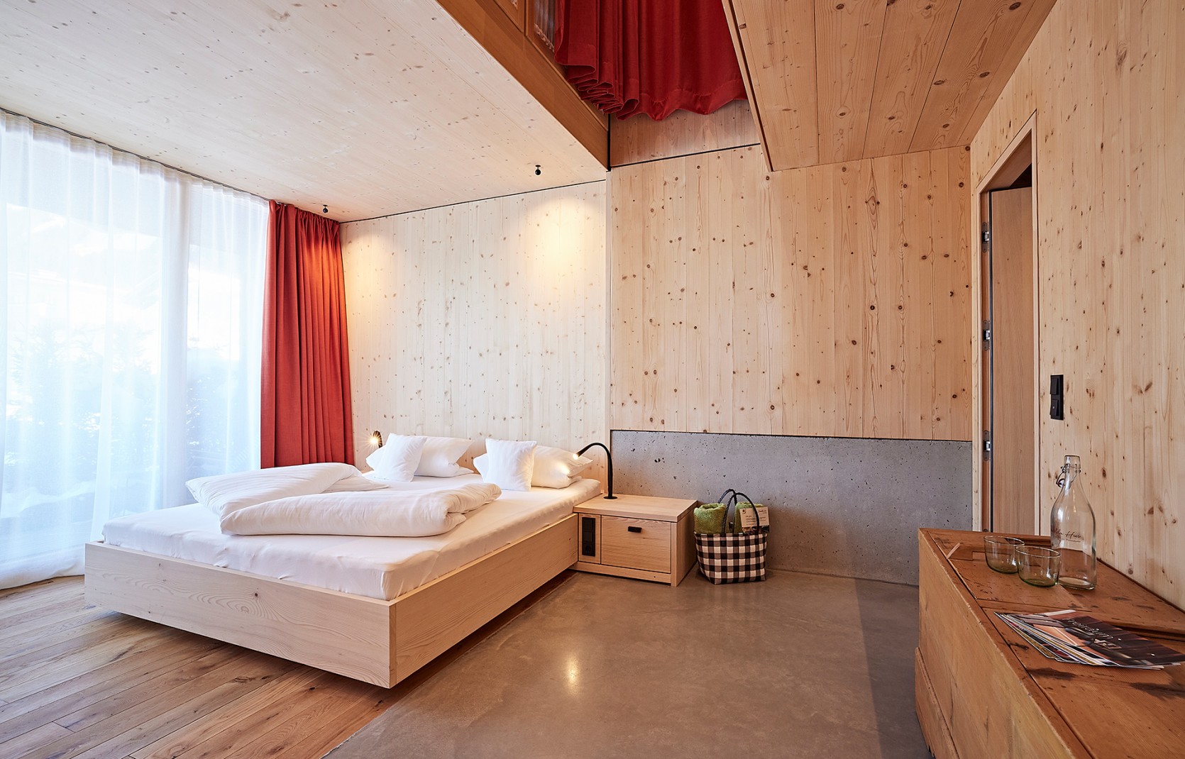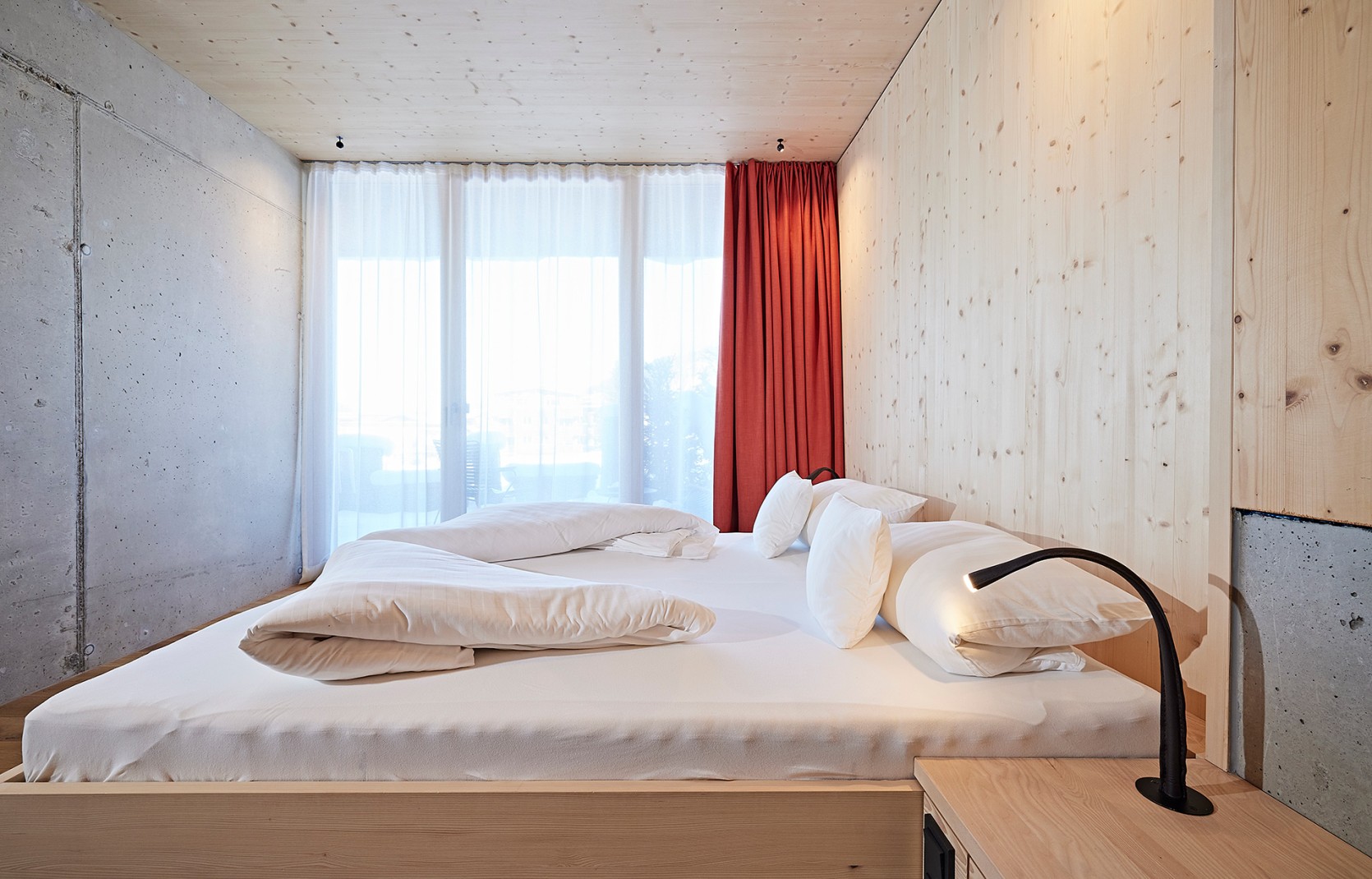Lichtdurchfluteter Schlafbereich mit Blick in die Berge