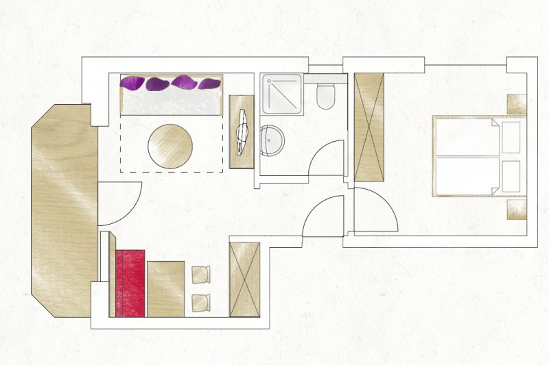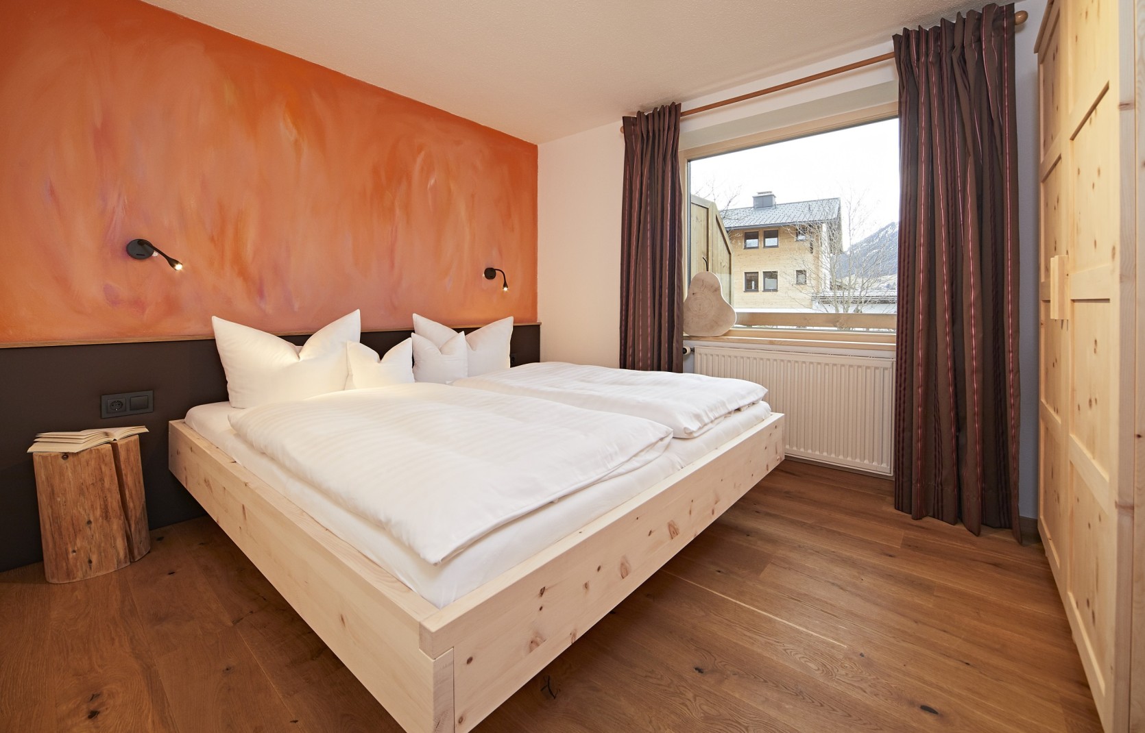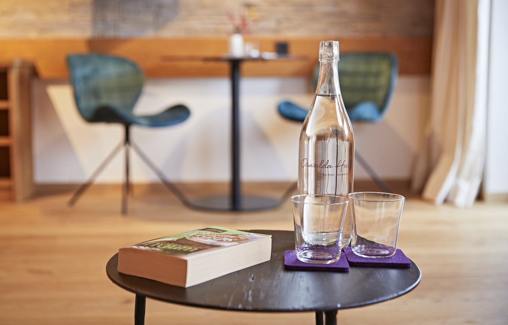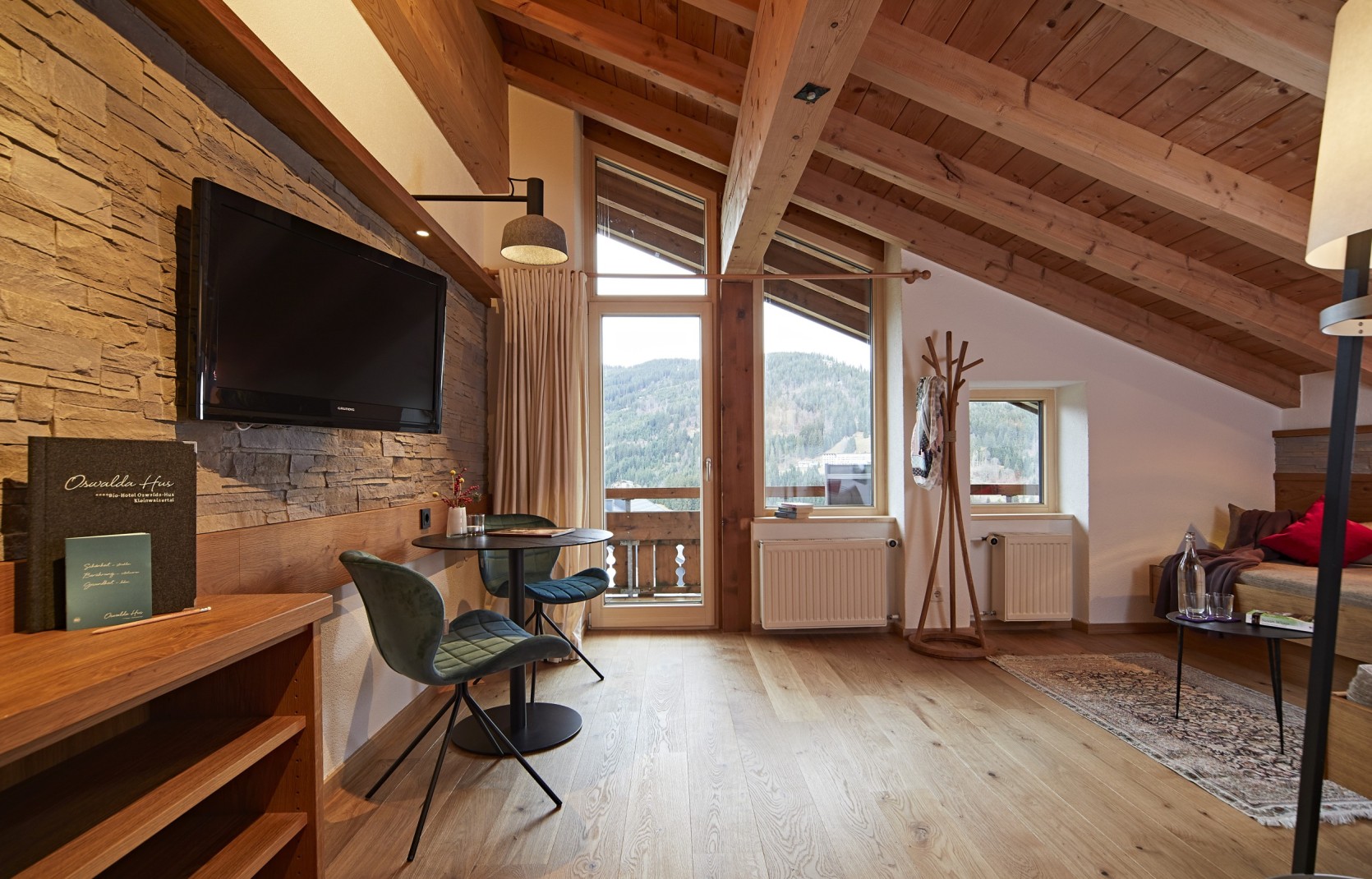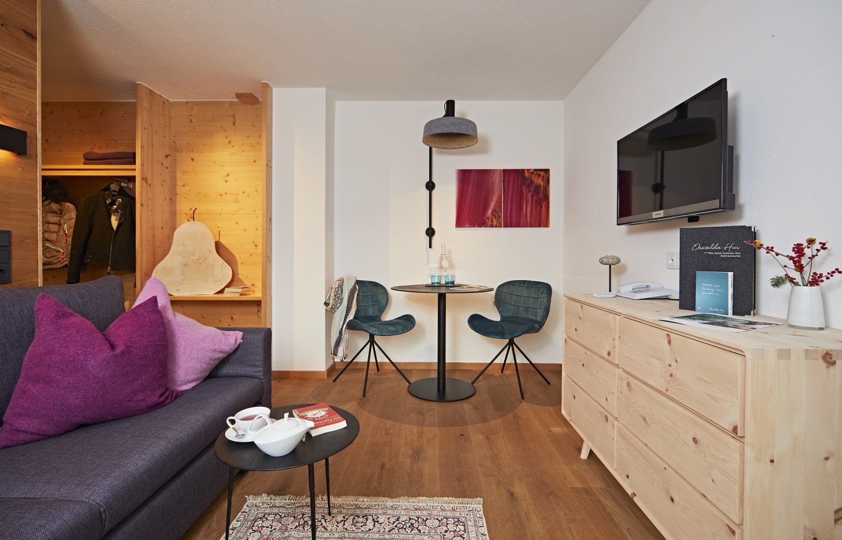 Living room with modern Swiss stone pine furniture and cosy chaise longue